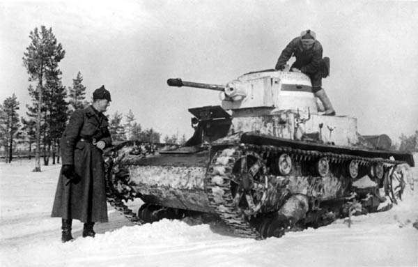 Подбитый танк Т-26. Подорвался на мине в р-не Хотиненского укрепленного района. Снимок сделан в январе 1940 г.
