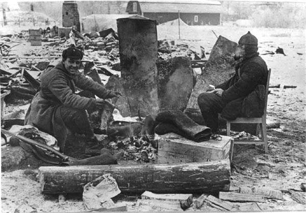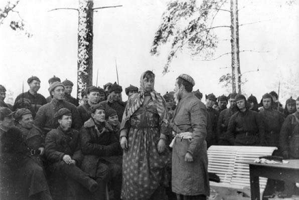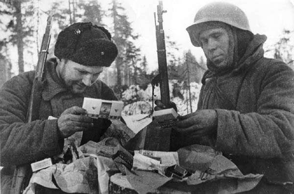 Красноармейцы П.Т.Онейко и Г.А.Михеев осматривают полученные подарки